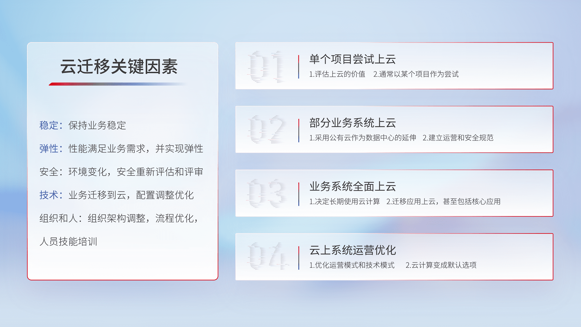 结合实际业务,,,,从规划设计、、、云平台选型、、、、云原生改造、、、数据迁移、、集成交付,,,迁移全过程为客户识别最佳上云路径,,,,做好风险识别管理,,,设计网络架构、、身份权限、、安全审计合规、、、、操作审计、、日志审计、、监控告警策略、、、、多站点容灾设计等,,,,对云上基础设施进行整体规划,,提升IT治理水平,,以满足弹性、、、高可用、、、、高性能的需求。。。。