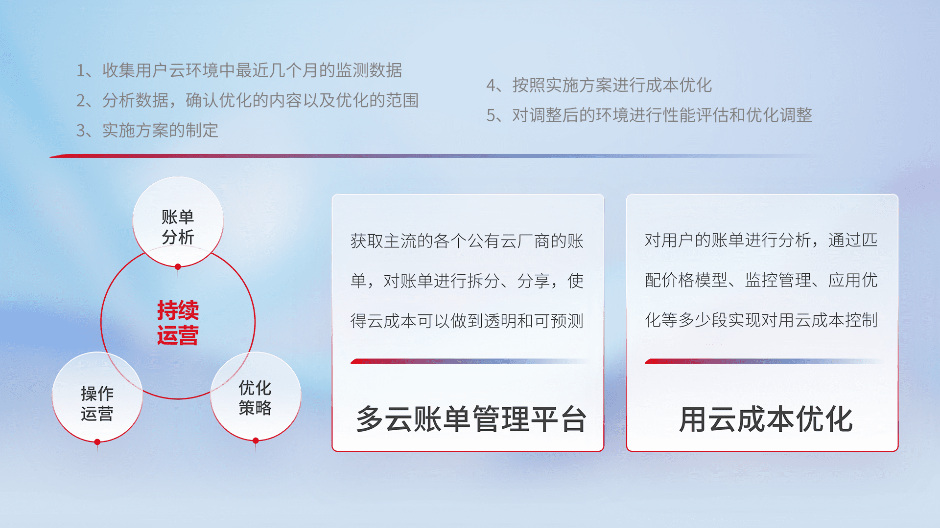 通过多云纳管,,,以统一的资源数据模型把客户的云资源进行抽象和封装,,进而实现对多云资源的统一操作,,保障云资源管理的可靠性、、、、稳定性与可用性。。。量身定制化运维内容,,,配置、、开发运维、、补丁管理、、备份、、、、监控、、、认证和访问管理、、、、审计和日常巡检等,,,保障在用云过程中的可靠度,,,,稳定度以及高可用率。。。。